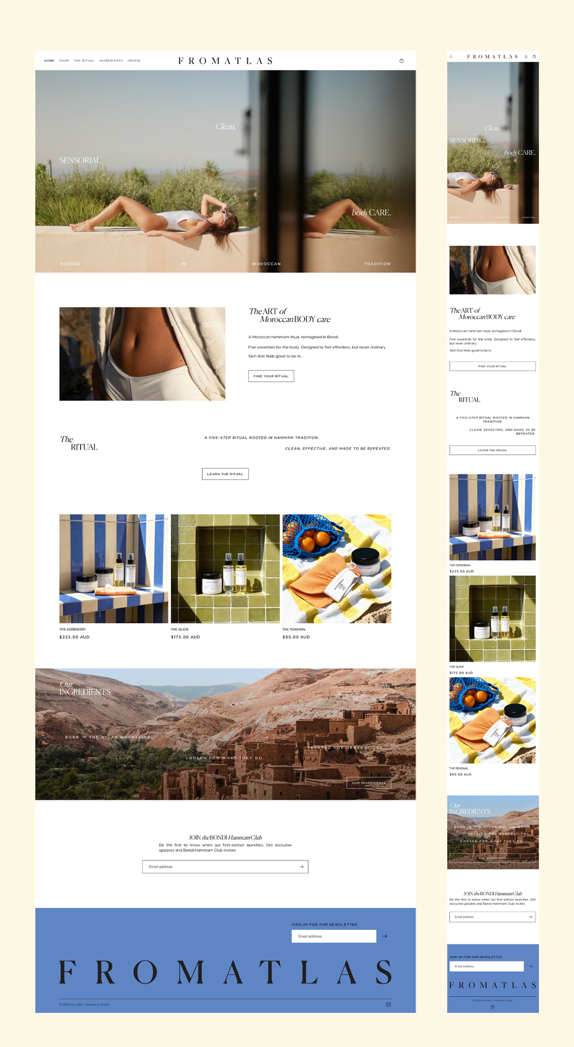 From Atlas is a skincare brand established in 2025, inspired by traditional Moroccan hammam rituals. The brand is based in Bondi, Australia, with products developed and manufactured in Morocco. I was responsible for the visual identity, packaging and web design. The objective was to create a clear and consistent brand system that reflects the origin of the products, their ritual-based use and their contemporary positioning.