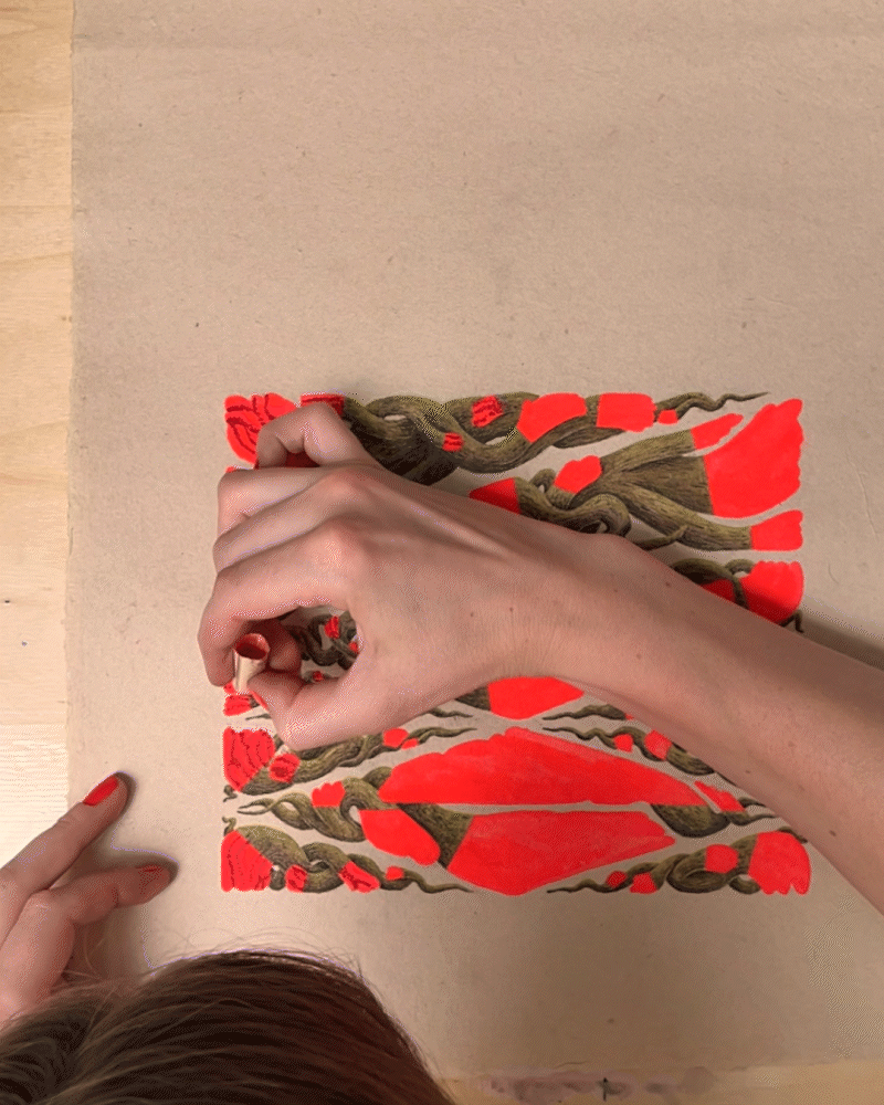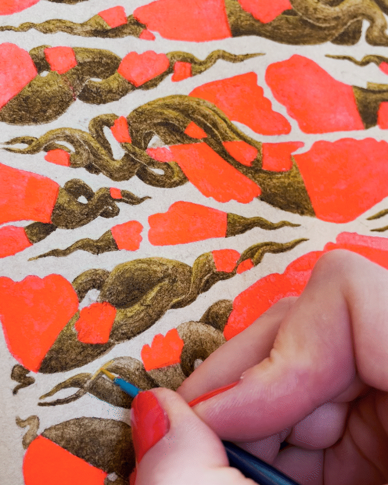 For the artwork, I built the composition around a triangular grid and the negative spaces formed inside it. The base structure comes from the letters KOBON, constructed within triangles and rotated to create the underlying layout — a hidden detail that becomes visible once you know it’s there. I then filled the shapes with hand-painted flowers to bring warmth and contrast to the geometric structure.